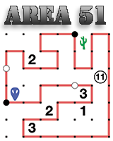 Here are hundreds of free Area 51 puzzles suitable for printing. Area 51 is a Slitherlink variant invented by David Millar. Along with Slitherlink, it also shares rules with Masyu and Corral (which I call Cow and Cactus). The instructions may seem quite complicated if you are unfamiliar with these other puzzles, but it's worth a little perseverance, as the combination of those elements makes for a uniquely satisfying solving experience.