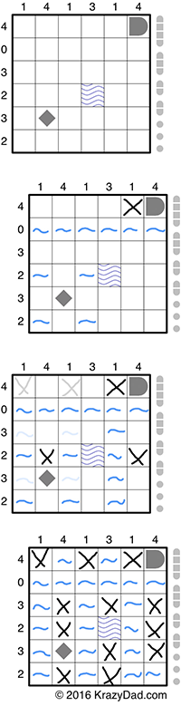 Each puzzle contains a row and column of numbers which indicate the number of squares in each row/column that contain a ship or ship segment. Most squares are empty, for you to fill in, but some will be givens, which indicate water, specific ships, or parts of ships. No ship may touch another ship, even diagonally.