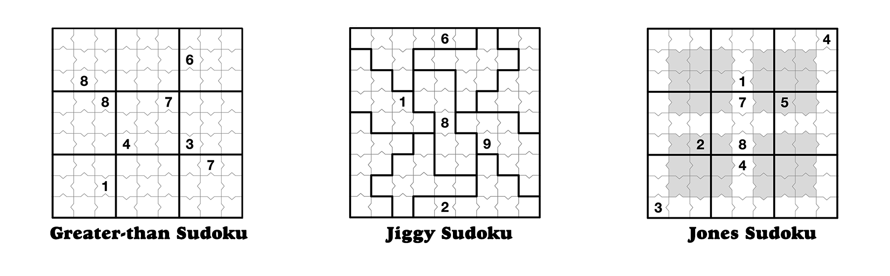 Greater-than Sudoku with irregular jigsaw-style regions.Jiggy Sudoku, Volume 1