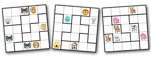 Pixidoku are an award-winning variety of Suguru that use picture tiles instead of numbers. Each booklet has a page of tiles to cut out, followed by 24 puzzles, which range in difficulty from 1 to 3 stars.