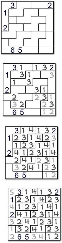 You'll see that the grid is subdivided into containers or cages, anywhere from 1 to 9 cells in size. You need to fill each cage with unique digits, counting up from 1. So for example a 2-cell cage contains the numbers 1 and 2. A 5-square cage contains all the numbers from 1 to 5. If two identical numbers appear in the same row or column, at least that many cells must separate them. For example, if two 3s appear in the same column, they must be separated by at least three other cells that do not contain 3. This unique ajacency rule gives the puzzles their unique cascading character, hence the name "Ripple Effect." Note that unlike Suguru, diagonal adjacency is always allowed.