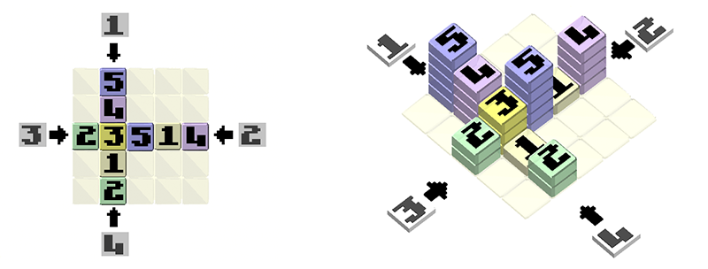 In each puzzle, the numbers within the grid represent the heights of buildings. Each row and column contains one building of each size. The extra clues, on the outside of the main grid, indicate the number of visible buildings (in a row or column) as seen from that vantage point.